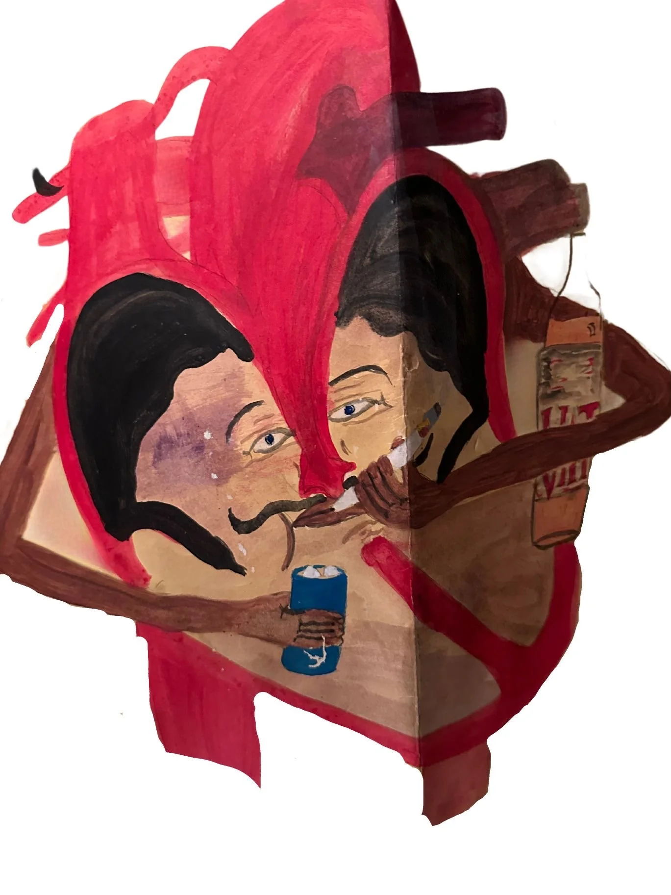 Painting of two men with black hair and mustaches, sharing a drink inside a red anatomical heart.