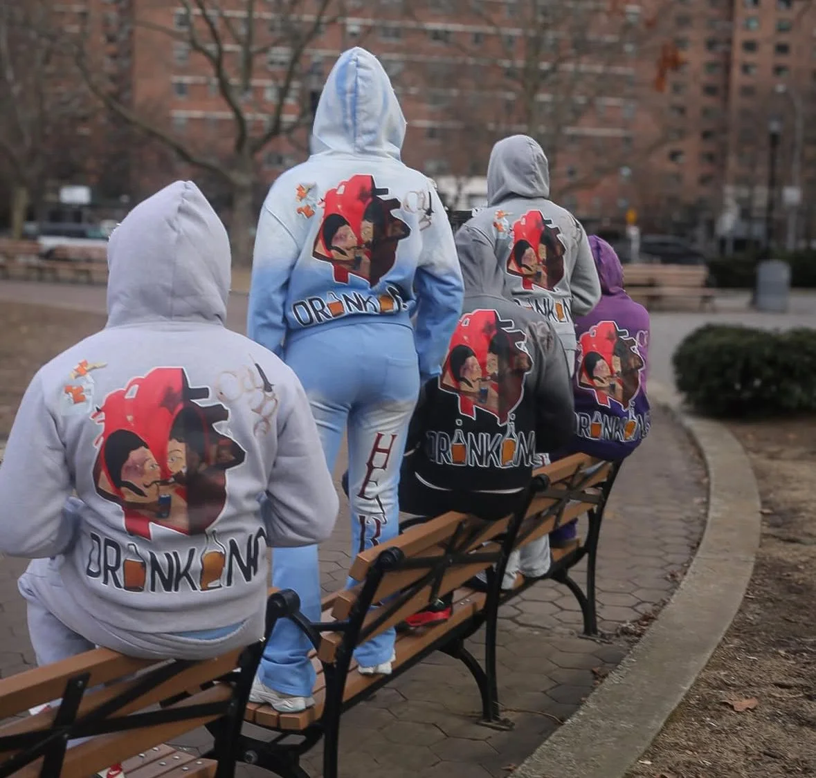 Five people with hoodies sitting and standing on a park bench, all wearing matching colorful hoodies with a graphic of a cartoon character and the text 'DRINK'. The park has a brick pathway, bare trees, and a cityscape in the background.