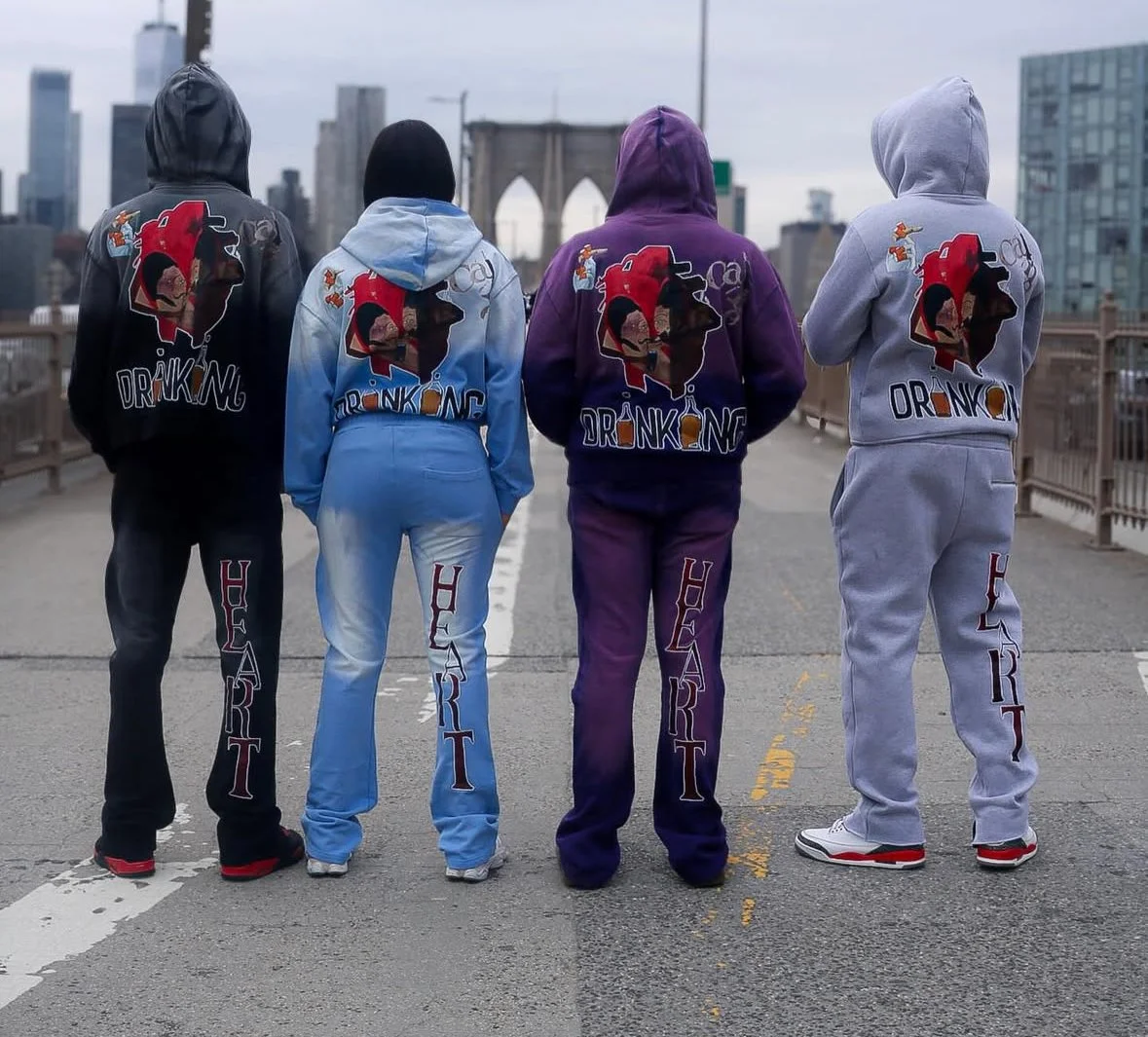 Four people standing on a city street, wearing hoodies and sweatpants of different colors with similar designs, facing away from the camera, with a city skyline and bridge in the background.